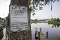 A public warning posted on to a cypress tree gives a warning about eating fish from Bayou Liberty in St. Tammany Parish on Thursday, July 2, 2020.