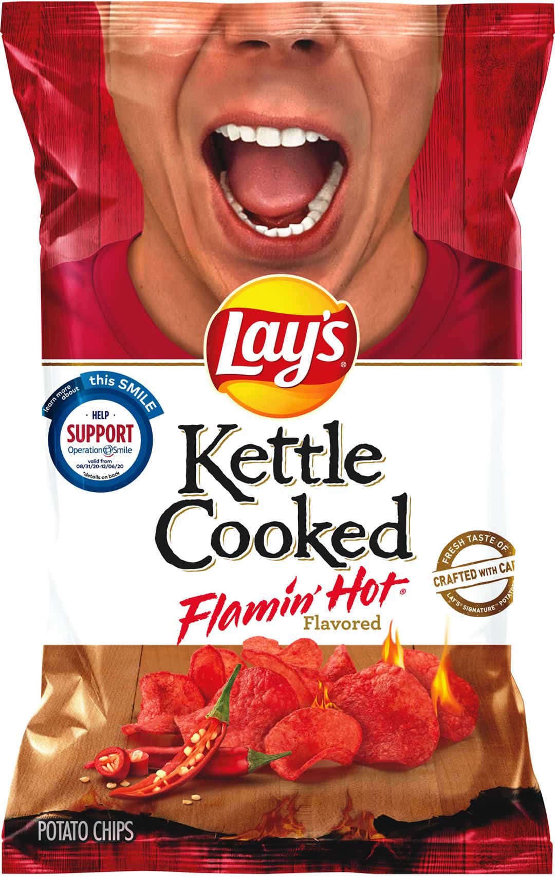 The grinning chips, part of the Smile with Lay's campaign, launched Sept. 14 at stores with nearly two dozen flavors ranging from fried pickles with ranch to cheddar jalapeƱo to kettle cooked flamin' hot, where Tuscany's mug (well, half mug) appears.
