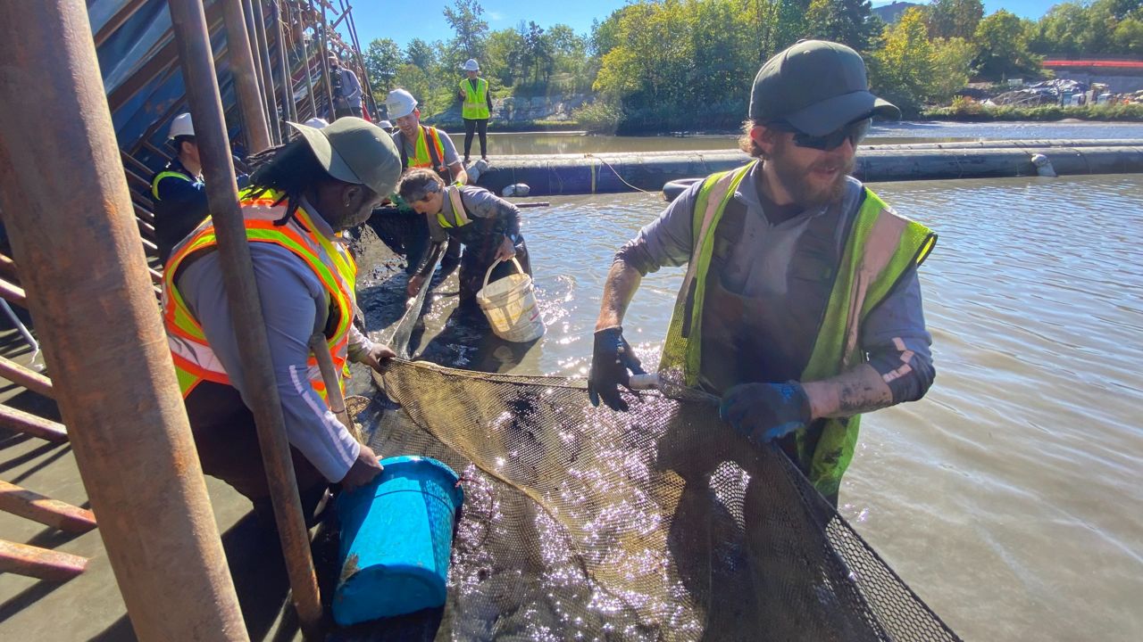 Before that can be done, crews were feverishly working to catch fish in nets, and quickly transport them in buckets to the other side of the dam. A variety of fish were located during the operation.